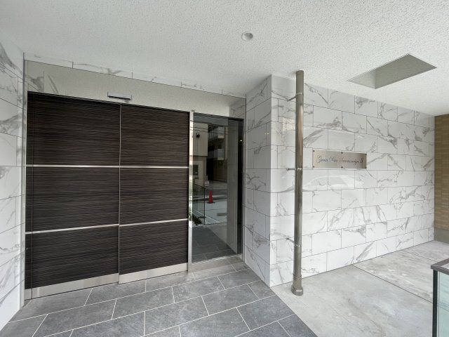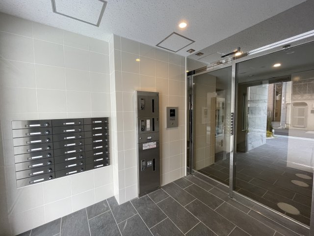 マンションのエントランスは、黒やグレーなど落ち着いたトーンで整えられており、控えめでありながらも洗練された印象を与えます。建物の外観からスムーズにアクセスできるエントランスは、居住者や来客の出入りがしやすく、視覚的にも「住まいの顔」として好感の持てる造りです。写真でも“エントランス”の表記が複数回確認されており、共用部の印象づくりにもこだわっていることがうかがえます。エントランスを入ると、ロビー(共用部ホール)につながり、玄関扉の先にはエレベーターや宅配ボックス、防犯カメラなどが設置された共用設備が整備されています。