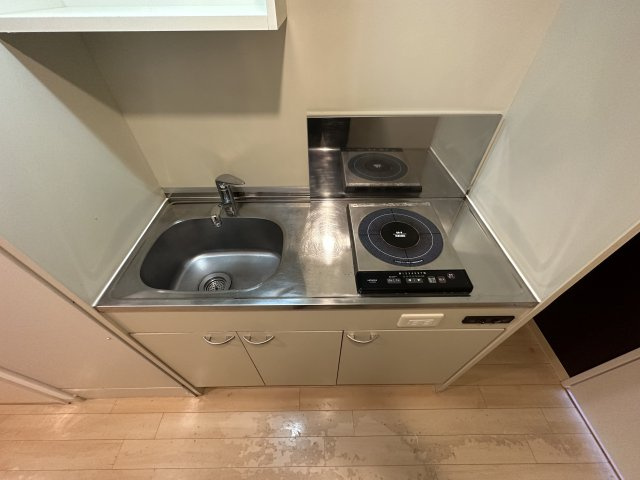ドミール春日野道Nのキッチンは、単身者向け1Kタイプの住戸に設けられた実用性の高いスペースで、日々の自炊や簡単な調理に十分対応できるつくりです。専有面積約25㎡の室内に対してコンパクトにレイアウトされており、洋室との動線も良く、効率的な生活動線を確保しています。キッチン部分は約2〜3帖程度の広さがあり、小さなワークスペースながら調理用具や食材を無理なく配置できる余裕があります。調理設備としてはIHクッキングヒーターの1口コンロが設置されており、火を使わず安全性が高いのが特徴です。ガスよりも手入れが簡単で、初めて一人暮らしをする方や忙しい社会人にも扱いやすい仕様になっています。シンクは適度な大きさで、調理後の洗い物や下ごしらえにも不便がありません。加えて、給湯設備も備わっているため、料理だけでなく洗い物や掃除の際にも快適に使えます。収納面でも、キッチン周りに調味料や食器、調理器具を収められるスペースが確保されているため、整理整頓がしやすく、清潔感のある空間を維持しやすいです。シンプルかつ機能的な作りであるため、生活スタイルに合わせてラックや小物収納を追加することで、より使いやすい自分だけのキッチン空間にカスタマイズすることも可能です。このように、ドミール春日野道Nのキッチンはコンパクトながら必要な設備が揃い、安全性と利便性に配慮された設計となっており、単身生活を快適にサポートします。