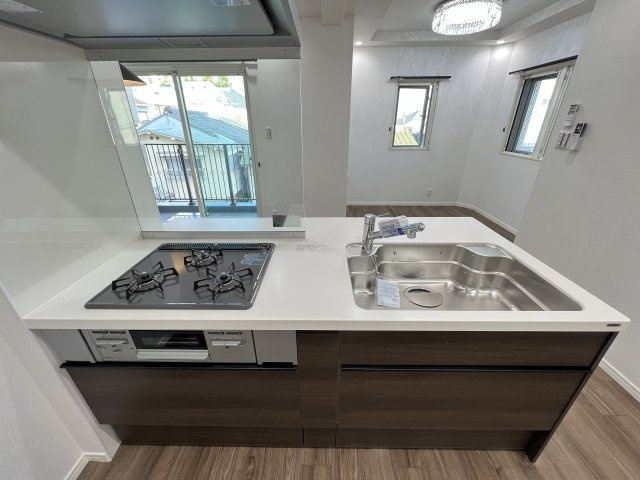 villa le Euphoria KITANOのキッチンは、日々の料理を快適に、そしてスタイリッシュに楽しめる設計が魅力です。部屋全体が1LDK・約51.3㎡というゆとりある間取りの中で、キッチンスペースは居住空間と自然につながるカウンターキッチン仕様になっており、リビングダイニングとの一体感を感じながら調理ができます。カウンターキッチンは友人や家族との会話を楽しみつつ、手際よく料理を進められるため、日常の家事がスムーズに行えます。調理設備はガスコンロが設置されており、3口以上のコンロ対応のシステムキッチンが備わっていることから、本格的な料理にも十分対応できる性能です。複数の鍋やフライパンを同時に使えるため、煮る・焼く・炒めるなど手早い調理が可能です。加えて、シンク周りには調理スペースや下ごしらえのスペースも確保されており、効率的なキッチンワークが叶います。収納についても使いやすさを重視した設計で、調理器具や食器類をきちんと整理できる収納棚が用意されています。水回り周辺は清潔感ある仕上げで、フローリングとも調和した内装が居心地の良さを演出します。また、カウンター越しにリビングを見渡せる配置は、来客時や日常のコミュニケーションを大切にしたい方にも嬉しいポイントです。全体としてこのキッチンは、機能性とデザイン性を両立させた空間であり、暮らしやすさと快適性を高める充実した設備が整っています。生活シーンに寄り添う仕様として、料理好きの方やお料理を楽しみたい方に特におすすめです。