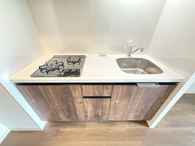 スワンズシティ神戸湊川の各住戸に設けられたキッチンは、毎日の料理や家事を快適にこなせる機能性と使い勝手の良さを重視した造りになっています。まず基本設備として、システムキッチンが標準装備されており、作業スペースがしっかり確保されているため、調理や後片付けをスムーズに行えます。ガスコンロは二口のガスコンロ対応(実際に二口コンロ設置済の部屋もあり)で、同時に複数の料理を進められる設計になっています。これにより、効率よく調理を進めたい人や、日常的に料理を楽しみたい人にも適しています。キッチン周りの内装は清潔感あるフローリングと統一され、扉やカウンターは掃除がしやすい素材が採用されているため、日々の手入れも負担になりません。また、収納スペースが豊富に設けられているのも大きな特徴のひとつで、引き出しやキャビネットには調理器具や食器、調味料などを整理して収納でき、限られたスペースでもすっきりと片付けられます。調理中の動線も考えられており、シンクやコンロ、冷蔵庫置き場の配置が効率的に設計されているため、料理の準備から片付けまでストレスを感じにくいレイアウトです。さらに、1Kタイプなどでは洋室との仕切りが確保されているため、調理時の臭いや煙が生活空間に広がりにくい工夫がなされており、清潔感ある生活環境が維持できます。こうした配慮により、単身者の一人暮らしはもちろん、カップルや二人暮らしでも快適に使えるキッチンスペースとなっています。
