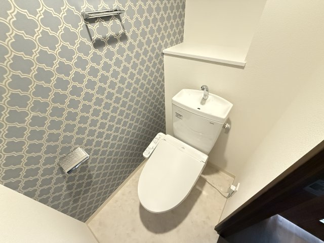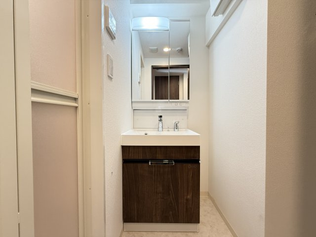 スワンズシティ神戸湊川の水回り空間は、快適性と清潔感を重視した設計になっており、単身・カップルの暮らしを支える設備が整っています。まずバスルームは、独立した浴室として設けられており、バス・トイレが別々になっているセパレートタイプです。これにより、入浴とトイレ使用の動線が分かれ、生活のストレスが軽減されます。浴室内には浴室換気乾燥機が装備されており、入浴後の湿気対策や、雨の日の洗濯物乾燥にも対応できる機能性が備わっています。換気乾燥機能はカビ予防にも役立ち、清潔な浴室環境を保つのに役立ちます。トイレは独立した空間にあり、温水洗浄便座付きで、快適な使用感を提供します。温水洗浄機能は、日本の賃貸住宅では人気の高い設備で、清潔さと利便性を高めるポイントです。トイレとバスが別になっていることで、家族やルームシェアでの生活でも使い勝手の良さを感じられます。洗面所は、独立した洗面化粧台と脱衣スペースを備えたゆとりある空間になっており、朝の身支度やスキンケア、歯磨きなどのルーティンを快適に行えます。洗面台には十分な鏡と収納スペースがあり、タオルや洗面用具を整理して置くことができます。また、洗面所と浴室の間にはドアが設けられているため、プライバシーが保たれ生活動線がスムーズです。さらに、室内洗濯機置場がこのエリアにあるため、洗濯から入浴までの動線が合理的で、毎日の家事がしやすい設計になっています。全体として、バス・トイレ・洗面所は分離されており、清潔感と機能性を両立した水回り空間です。