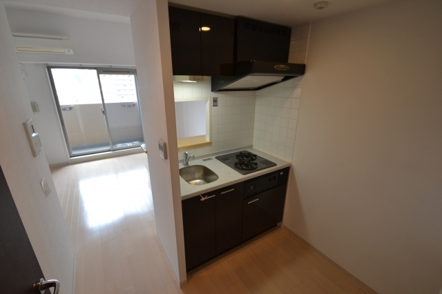 ライジングコート三宮マリーナシティのキッチンは、単身者向け1Kタイプの居住空間にふさわしい機能性と使い勝手を両立した造りになっています。システムキッチンが標準装備されており、ガスコンロが設置済みで2口以上のバーナーを使えるタイプの部屋も多く、毎日の調理がスムーズに行える仕様です。都市ガスによるガスコンロの火力は、簡単な料理から本格的な調理まで対応しやすく、一人暮らしでも快適に料理を楽しめます。カウンターキッチンになっている部屋もあり、居室との境界が開放的で圧迫感が少なく、調理中もリビングスペースと一体感を感じられるのが大きな魅力です。カウンター越しに食事や会話を楽しむこともでき、コンパクトな間取りでも空間を有効活用できます。キッチン周りには収納スペースが設けられており、調理器具や食器、調味料などを整理しやすい設計です。シンク下や上部の収納を活用することで、必要なものをすっきりと片付けられ、作業スペースを確保できます。また、給湯設備も整っているため、日々の水回りの使い勝手も良好です。築年数が比較的新しい建物であるため、キッチン全体のデザインや設備も現代的な印象を持ち、清潔感ある状態が保ちやすい点も魅力のひとつといえます。単身生活の中での調理や片付けがストレスなく行える、実用性に優れたキッチン空間です。
