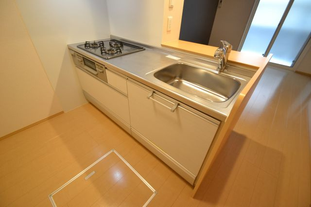 「テラコート北野坂」のキッチンは、暮らしの中心となるLDK空間と一体になった使い勝手の良い設備が魅力です。専有面積約40.13㎡の1LDK住戸には、システムキッチンが標準装備されており、料理や家事が快適に行える仕様になっています。都市ガス対応のガスコンロが3口設置可能で、複数の料理を同時進行しやすく、調理効率が高い点が大きなメリットです。広めの調理スペースとシンクは日々の調理をストレスなく進められ、食器や調理器具を整理できる収納も確保されています。カウンターキッチンスタイルにより、リビング・ダイニングとの一体感があり、調理しながら家族との会話やテレビを楽しむことができます。LDKとの動線も良く、料理後の片付けや配膳がスムーズです。キッチン自体はフローリングのLDK空間と調和するデザインで、無駄な仕切りが無く開放感を保ちながら機能性を重視した作りです。また、カウンタータイプであるため、調理中もリビングの様子を確認でき、来客時や日常のコミュニケーションにも配慮されています。ガスコンロ部分は換気扇が近くにあり、調理時の煙やにおい対策もしっかりされているため、住まい全体を清潔な状態に保ちやすい構造です。さらに、キッチン周辺には室内洗濯機置場や収納スペースが近接しているため、家事動線が効率よく設計されている点も魅力です。毎日の料理や片付けがしやすく、テレワークでの飲み物準備や軽い自炊にも対応しやすい仕様になっています。これらの設備から、「テラコート北野坂」のキッチンは実用性と居住性を両立させた快適な空間として評価できるでしょう。
